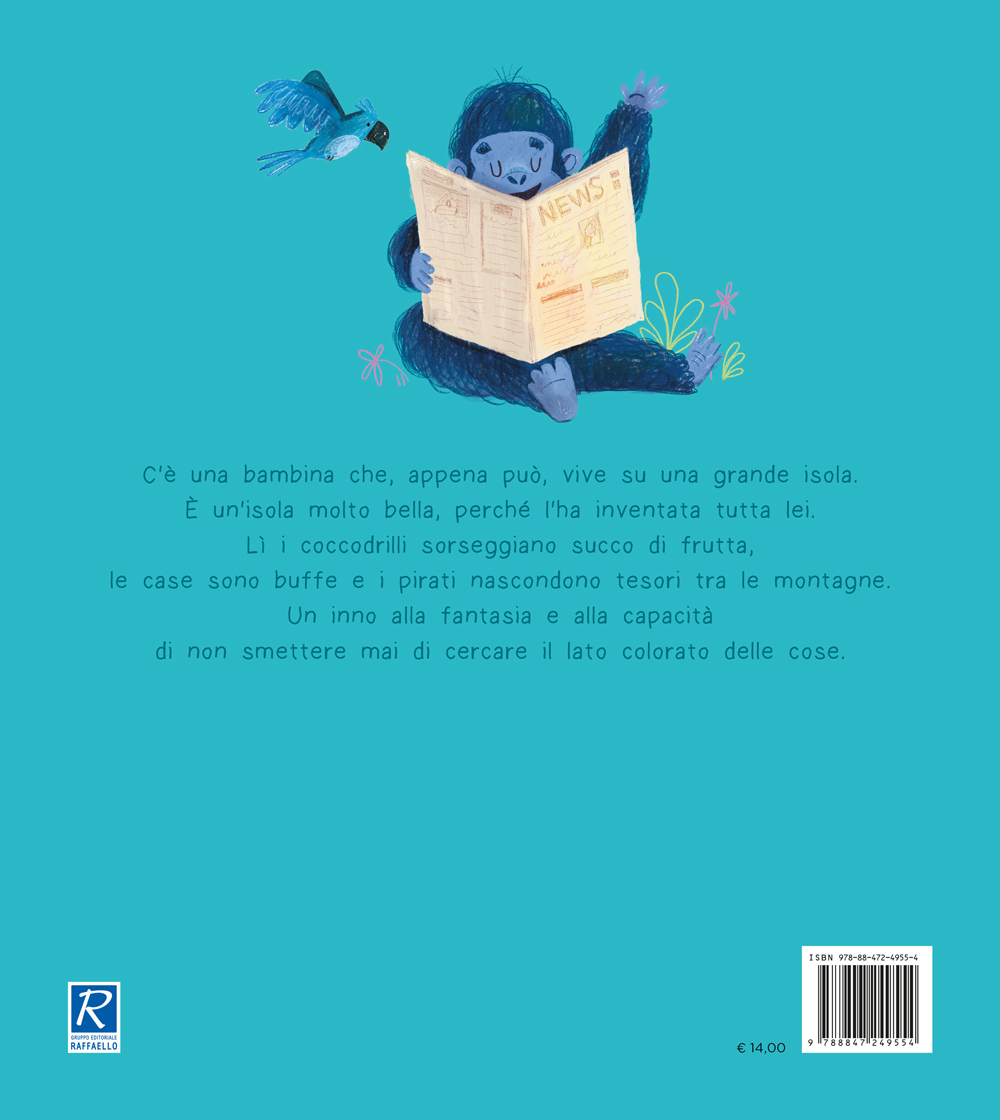 È un’isola molto bella, perché l’ha inventata tutta lei. Lì i coccodrilli sorseggiano succo di frutta, le case sono buffe e i pirati nascondono tesori tra le montagne. Un inno alla fantasia e alla capacitàUn capacità di non smettere mai di cercare il lato colorato delle cose.