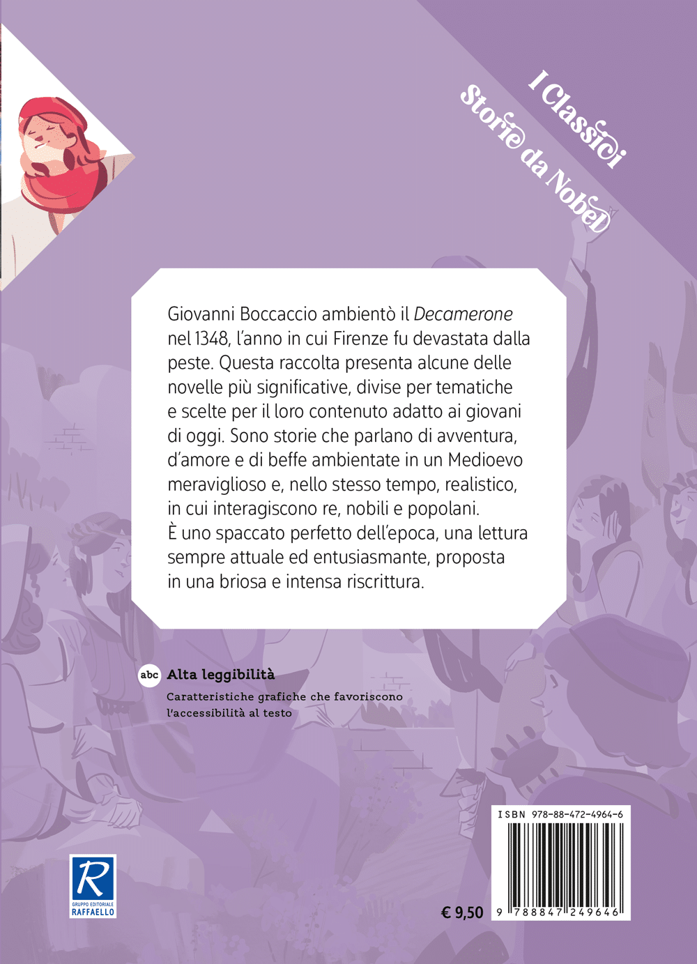 Giovanni Boccaccio ambientò il Decamerone nel 1348, l’anno in cui Firenze fu devastata dalla peste. Questa raccolta presenta alcune delle novelle più significative, divise per tematiche e scelte per il loro contenuto adatto ai giovani di oggi. Sono storie che parlano di avventura, d’amore e di beffe ambientate in un Medioevo meraviglioso e, nello stesso tempo, realistico, in cui interagiscono re, nobili e popolani.