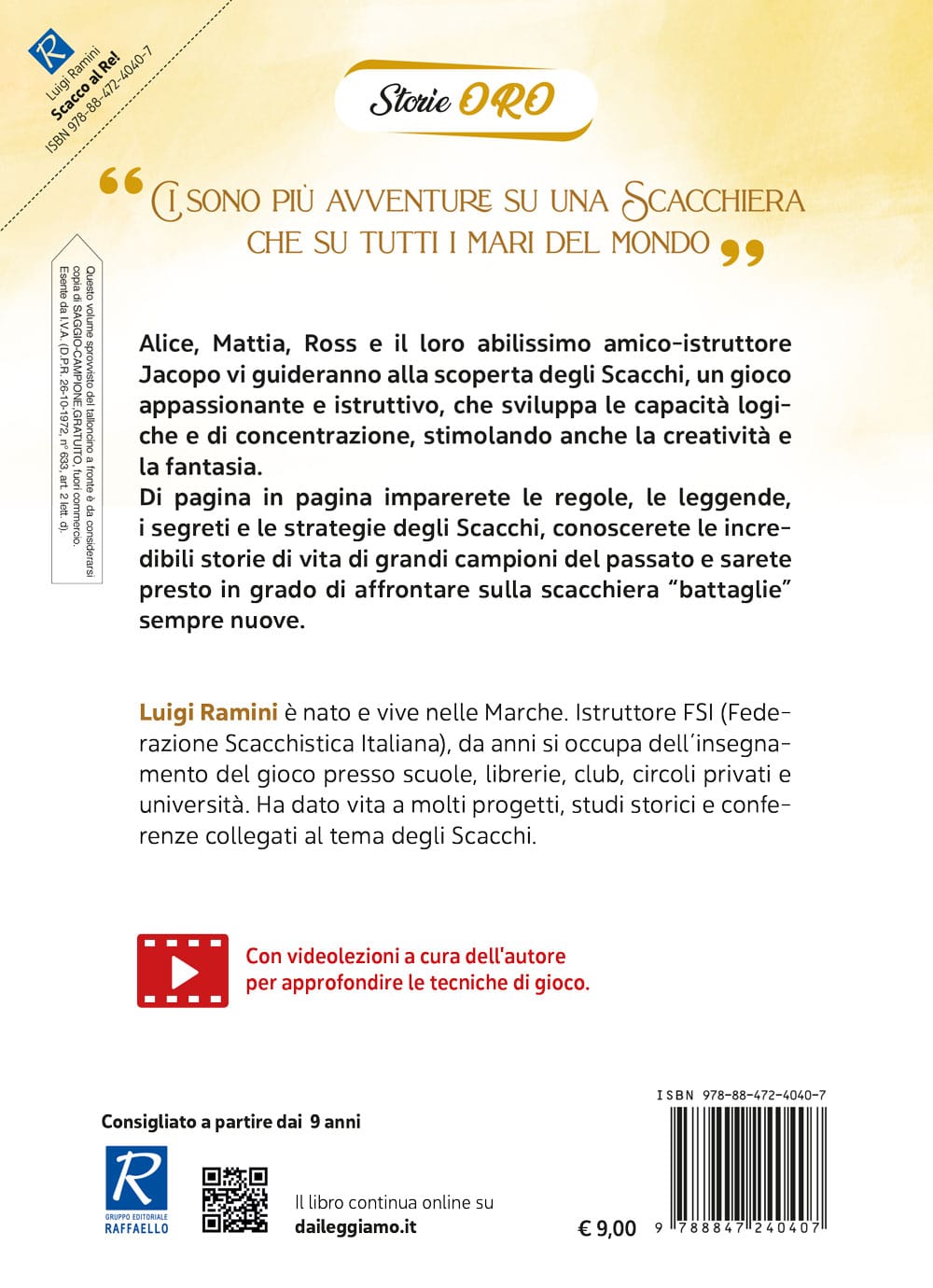 Alice, Mattia, Ross e il loro abilissimo amico-istruttore Jacopo vi guideranno alla scoperta degli Scacchi, un gioco appassionante e istruttivo, che sviluppa le capacità logiche e di concentrazione, stimolando anche la creatività e a la fantasia.